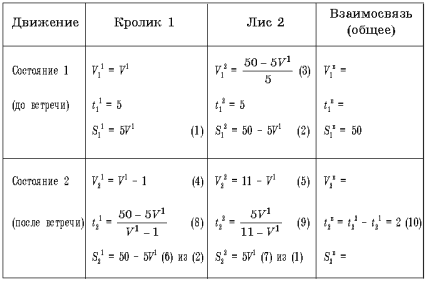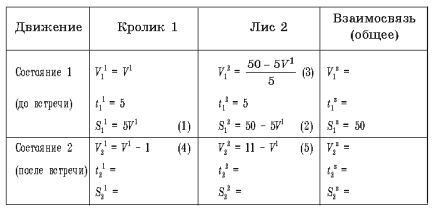 Для того, чтобы проанализировать первое состояние, нам необходимо ввести значения компонент, которые мы как бы знаем. Пусть это будет скорость кролика – V1. Тогда имеем (в скобках цифрами мы проставляем последовательность наших рассуждений):
