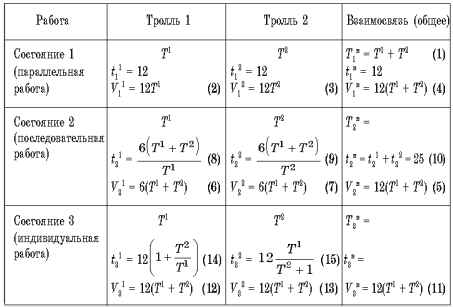 (2) Сколько возможных состояний в работе? – Три: а) совместная (параллельная) работа; б) поровну произведенная работа (последовательная работа); в) каждый сам за себя (индивидуальная работа).