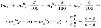 Задача 3. Алиса, будучи в Зазеркалье, нашла две плошки смеси божьего дара с яичницей. Одна из них содержала a% божьего дара, а вторая – b%. В каком отношении Алиса должна взять эти смеси, чтобы при перемешивании получить новую смесь с массовым процентным содержанием божьего дара в g%?